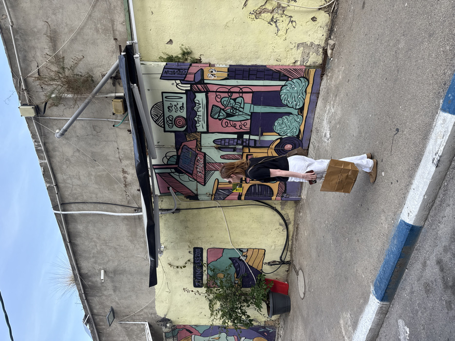 A female subject, appearing to be in her 30s or 40s with reddish-brown hair, is walking on an asphalt street in Haifa, Israel, specifically in the lower city area known for its street art, likely near the Flea Market or Turkish Market