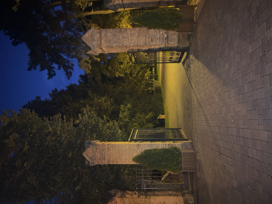 The image depicts the main entrance to Chelyuskintsev Park in Minsk, Belarus, observed at night. The scene features two substantial, reddish-brown brick gateposts with decorative, crenellated tops, centrally positioned. An open, dark metal gate is visible, with one leaf extending to the right and the other partially obscured to the left, revealing an ingress to the park. At the base of each gatepost, a conical evergreen shrub is planted within a dark wooden planter. The foreground consists of dark reddish-brown rectangular paver stones laid in a stretcher bond pattern, creating the entranceway pavement. Beyond the gate, a dirt or gravel path extends into the park, brightly illuminated by a distinct yellow-orange artificial light source, which casts long, sharp shadows of the gateposts and the gate onto the paved area. Dense, dark green trees with visible foliage fill the background and periphery of the park, silhouetted against a deep blue night sky that suggests late twilight or early night. A small, light-colored wooden structure, possibly a bench or small shelter, is visible on the left side of the illuminated path deeper within the park. No individuals, animals, or explicit actions are present in the scene.