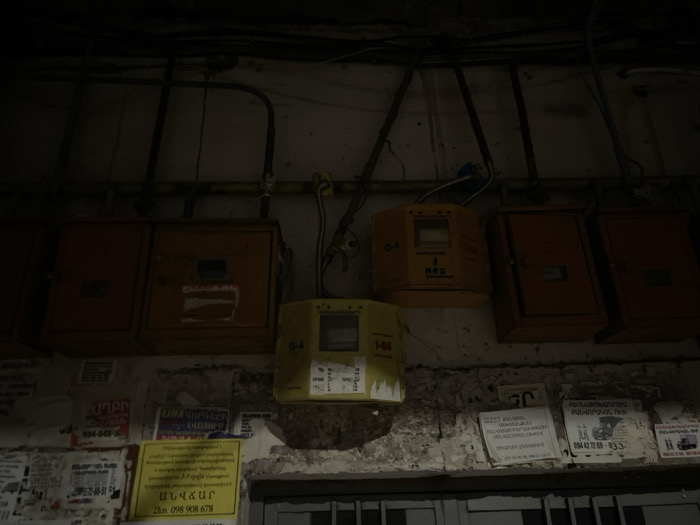 The image depicts a dimly lit, weathered urban wall in Yerevan, Armenia, covered with utility infrastructure and numerous paper advertisements