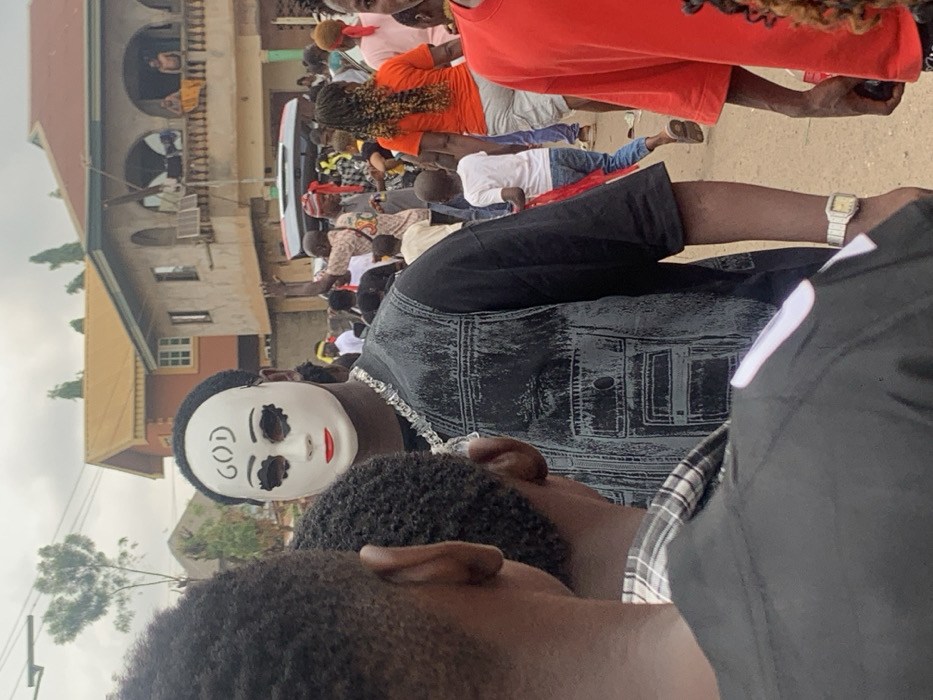 This image captures a dense outdoor gathering in Otuocha, Nigeria, centered on a masked individual