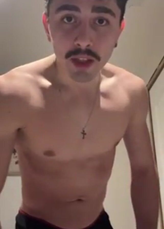 A shirtless man with a mustache, wearing black shorts and a cross necklace, stands in a room and flexes his abdominal muscles for the camera