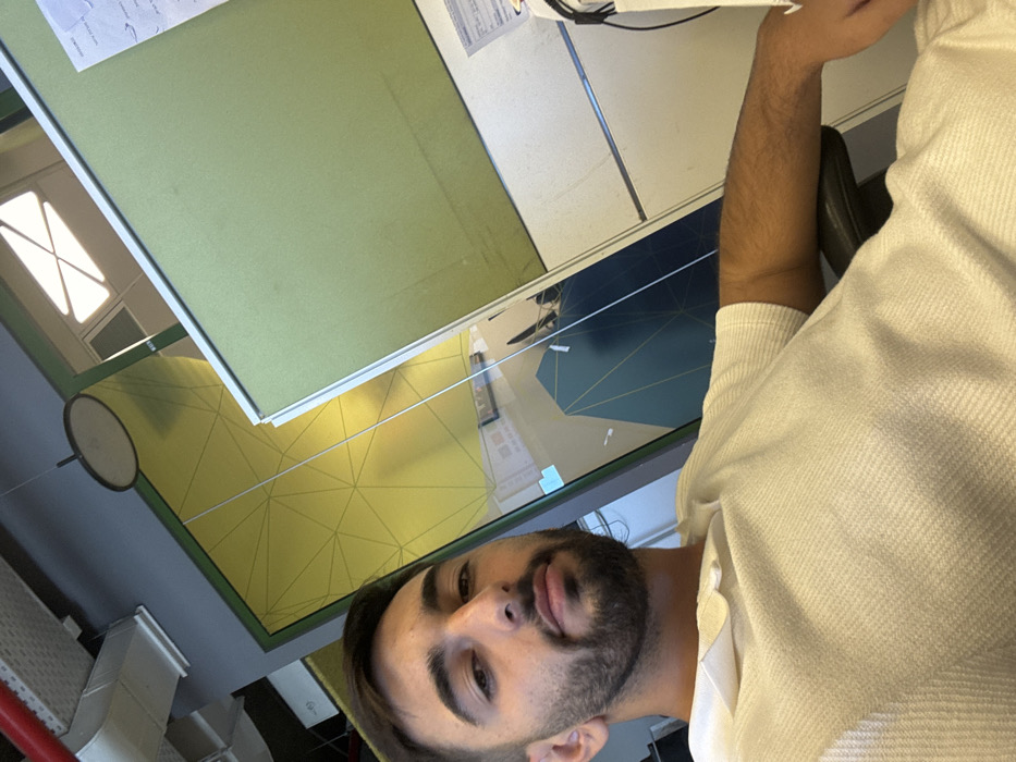 The image displays a male individual seated in an office environment in Holon, Israel. The subject, characterized by dark hair and a trimmed beard, wears a white textured polo shirt and directly faces the camera. To his immediate right is a light green office partition with documents affixed to its upper section. Behind him, a glass partition featuring a yellow-green geometric pattern, composed of interconnected lines, reflects portions of the office interior, including a distinct light blue rectangular element. The exposed ceiling overhead incorporates dark gray structural components, red piping, silver ventilation ducts, a circular pendant light fixture, and a square recessed light with an X-shaped diffuser. The scene conveys a modern office aesthetic.
