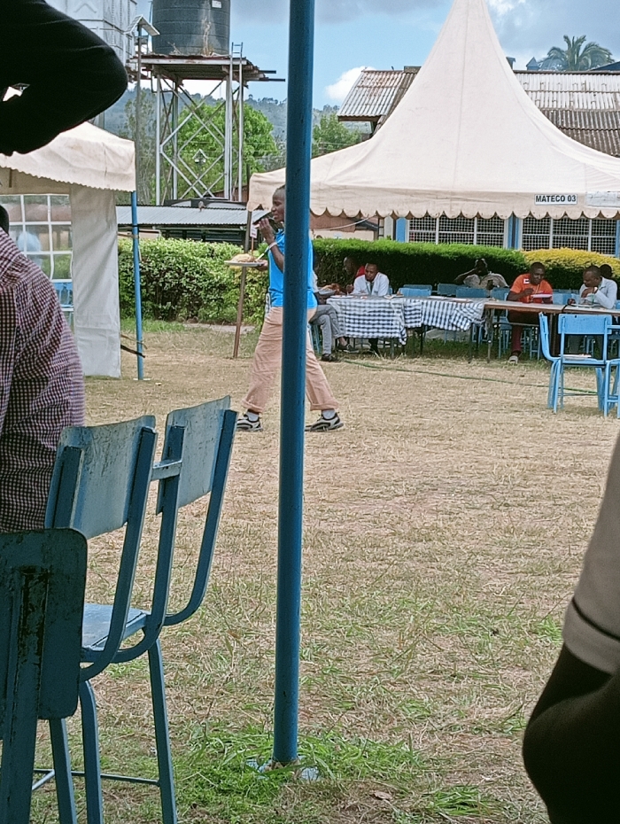This outdoor scene, set in Machakos Central ward, Kenya, features a gathering with a speaker. In the immediate foreground, two empty, faded teal metal chairs are partially visible on the left, and a vertical blue metal pole stands slightly right of center. The ground is covered with dry, patchy grass. In the midground, an individual, likely male, in a light blue collared shirt, tan trousers, and athletic shoes, walks from left to right. They hold a silver microphone to their mouth with their right hand and a white plate containing yellow, textured food (possibly fried plantains) with their left hand, suggesting they are speaking or performing. Behind this individual, under a large white peaked tent, five people are seated at two tables covered with blue and white checkered tablecloths. They appear to be observing or listening. One seated individual prominently wears an orange t-shirt. The background features the large white peaked tent, which has "MATECO 03" printed in blue lettering on its side. To the left of this tent, a smaller white tent is visible. Further back, a building with a blue lower section and a rusty corrugated metal roof is present. On the far left, a tall metal structure supports a large, dark water storage tank. Distant green foliage and hills are visible under a partly cloudy sky.