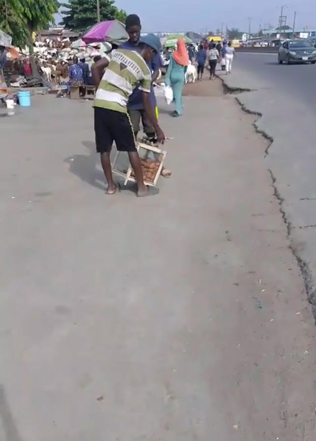 two young men standing on the shoulder of a road, facing each other. One man, wearing a striped shirt, black shorts, and a blue hat, appears to be selling something from a small wooden crate he is holding. The crate contains brown, round objects that resemble coconuts. The second man, in a blue shirt and dark shorts, is looking at the contents of the crate. To the left, there are people sitting or standing around what appears to be a small market or gathering. In the background, there's a road with cars and a yellow tricycle driving by. Other people are walking along the sidewalk, and the sky is bright. The shoulder of the road is concrete with cracks along the edge.