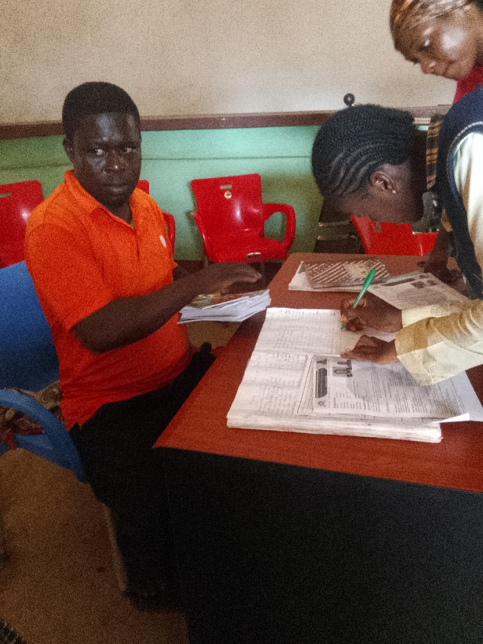 The scene is an indoor setting in Umuokpu, Nigeria. Three individuals are present around a reddish-brown wooden table with a dark base. On the left, a dark-skinned male wearing an orange polo shirt and dark trousers is seated on a blue plastic chair, looking directly towards the viewer. His hands are positioned over a stack of white papers on the table. To his right, a dark-skinned individual with braided hair, wearing a light-colored long-sleeved shirt and a dark vest, leans over the table, actively writing with a green pen on a stack of newspapers or documents. A small, patterned rectangular object rests near the documents. Partially visible in the upper right, a third dark-skinned individual wearing a patterned headscarf and a red garment observes the activity at the table. The background features light-colored walls with a horizontal green band and several unoccupied red plastic chairs.