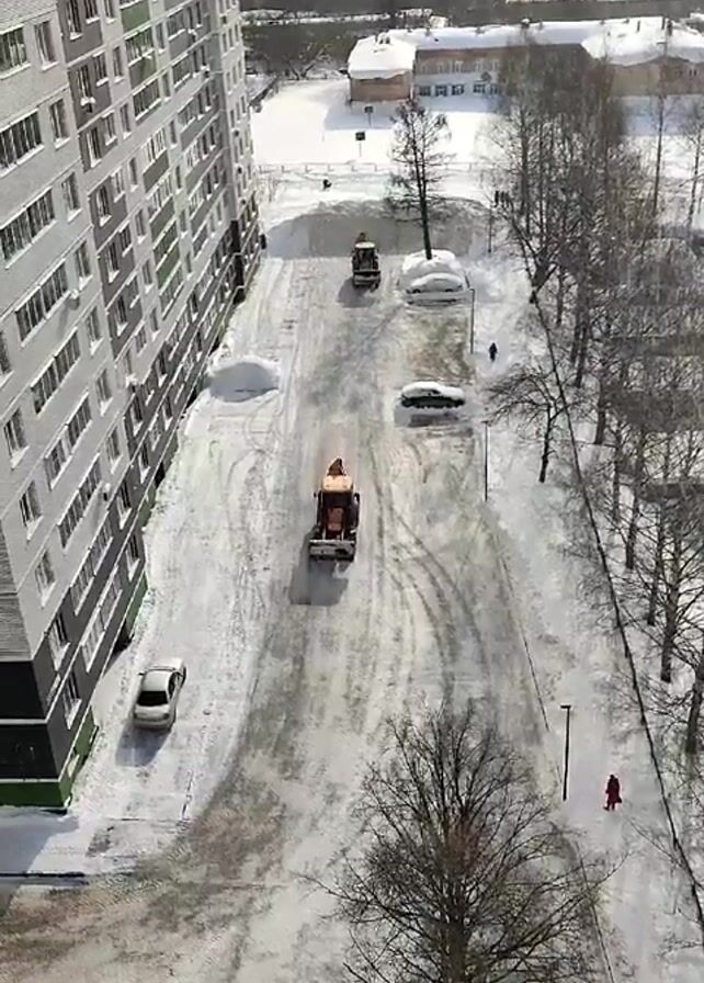 high-angle view of a winter scene in a city. Two orange snowplows are clearing a street covered in snow and ice that runs between a tall apartment building on the left and a row of bare trees on the right. Several cars are parked along the street, some partially covered in snow. Small piles of cleared snow are visible along the sides of the road. In the background, there are other buildings, including a low-rise structure with a snow-covered roof, and another tall apartment building. A person dressed in red walks along the sidewalk on the right side of the street. The sky is overcast and the overall lighting is somewhat dim.