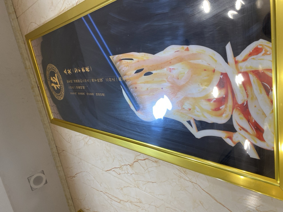 A framed advertisement hangs on a marbled wall. The frame is gold and the poster is black with gold Chinese characters on the left side. The poster features a brightly lit image of noodles, predominantly white and orange. Light reflections are prominent on the poster's surface. The text suggests the product may be wheat-based and provides instructions on proper consumption. A white circle is visible on the wall beside the poster.