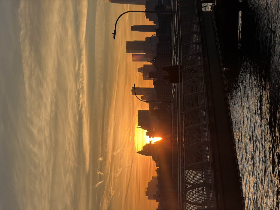A captivating sunset illuminates a cityscape silhouette against a textured sky, streaks of clouds mirroring the urban outline. The setting sun creates a radiant focal point, its light casting a golden hue across the buildings. Adjacent to the cityscape, a bridge structure is visible, with the reflective surface of water completing the scene's edge. The image encapsulates an urban serenity at twilight.