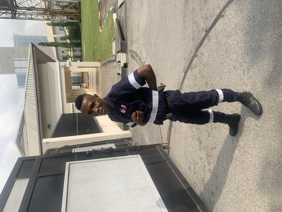 An adult male, with a dark complexion and short dark hair styled with faded sides, stands on a light grey paved surface outdoors in Alaguntan, Nigeria. He wears a dark blue short-sleeved work uniform featuring a red and white "O&S" logo on the left chest, two horizontal white stripes across the chest, and two horizontal white stripes on the lower legs of the trousers. A black belt with a metallic buckle is around his waist, and a dark-colored object, possibly a communication device or tool, is tucked into the right rear of his belt. He wears black lace-up boots. His right hand is positioned near his chest, while his left hand is behind his back. He faces forward, looking towards the camera with a neutral expression. To his left is a partially open dark metal gate with a white rectangular perforated board attached to its inner surface. Behind the man, a cream-colored building with a grey sloped roof and an open archway is visible. To the right of this building, a manicured green lawn extends. In the distant background, several modern high-rise buildings and a metallic lattice tower structure are visible against a light, overcast sky. A circular metal track is embedded in the pavement in the foreground. Shadows are cast on the pavement, indicating a light source from the upper right.