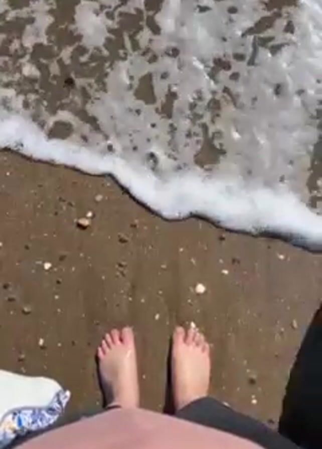 pair of bare feet standing on a beach. Waves are crashing onto the shore, washing over the feet. The beach is covered in sand and small pebbles. The person is wearing a pink top and black pants. A small, patterned cloth is visible on the left side of the frame.