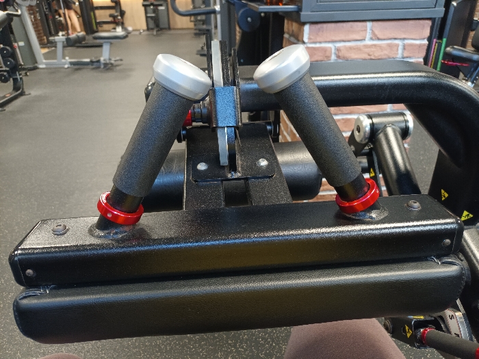 The image depicts a close-up, eye-level view within an indoor fitness facility, specifically focusing on the leg rest and adjustment mechanisms of a gym exercise machine. The primary subject is the black metal frame of a resistance training machine, likely a leg extension or hamstring curl apparatus. In the center, two padded, textured black handles with silver caps protrude upwards and slightly outwards, anchored to the frame. Below each handle is a red, circular adjustment ring featuring white numerical markings. Directly beneath these handles is a black, horizontally positioned padded rest, likely covered in synthetic leather or vinyl. In the lower center-right of the frame, a segment of a human leg, covered in light brown or beige fabric, is visible, indicating a person is seated on or interacting with the machine. The background, out of focus, reveals additional gym equipment including benches, weight racks, and other machines. The floor is covered with a dark, speckled rubber gym flooring. A section of a wall featuring exposed brickwork is visible on the right side of the background. Yellow and black warning or instructional decals are visible on the machine's frame to the right. The scene is located in a gym in Blagoevgrad, Bulgaria.
