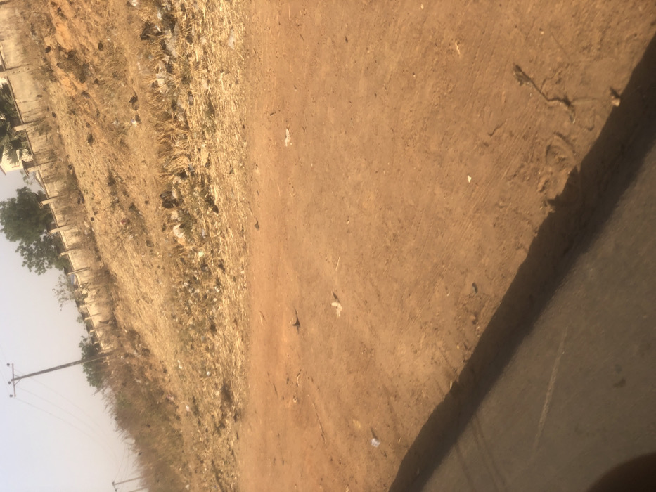 A sun-drenched landscape depicts a dirt path bordered by dry vegetation and sparse trees. Power lines traverse the scene, suggesting a rural or developing area. Structures with white walls are visible in the distance. A concrete edge and a glimpse of a paved road appear in the foreground. The image has a hazy, muted color palette dominated by browns and tans.