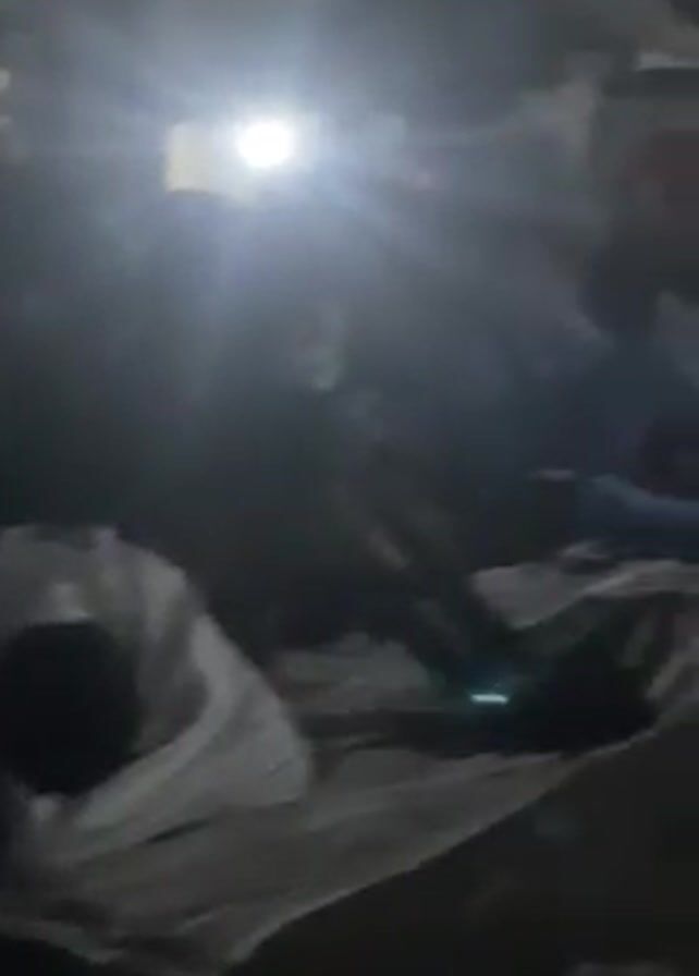 group of people in a poorly lit outdoor space. Some people are sitting on the ground, while others are seated in chairs or standing. There is a building in the background, partially illuminated by lights. The camera is moving. Overall, the scene appears crowded and dimly lit.