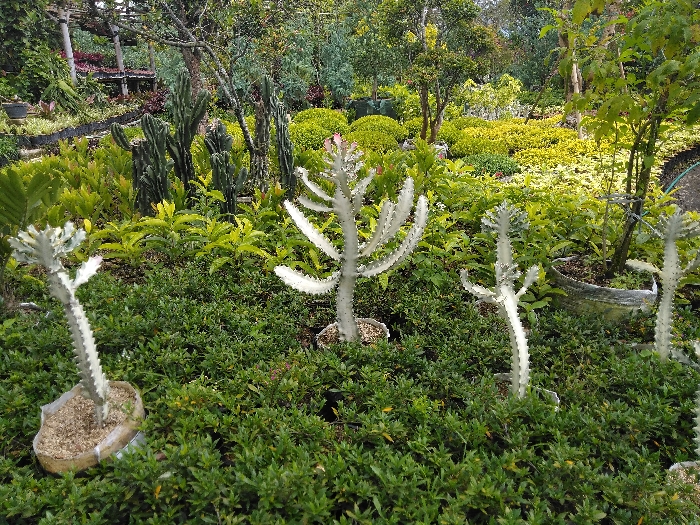 The image displays an outdoor plant nursery or garden area located in El Rincón de Monagas, Venezuela. The scene is densely populated with diverse plant life under ambient daylight. In the immediate foreground, a bed of low-growing, small-leaved green plants covers the ground. Within this bed, four prominent white-stemmed, columnar succulent plants, consistent with *Euphorbia lactea 'White Ghost'*, are visible. The plant on the far left is rooted in a beige, cut plastic bottle acting as a planter, filled with light-colored substrate. The other three white succulents are situated in dark pots, with the central specimen exhibiting a reddish growth tip. Beyond the foreground, the nursery features organized rows and beds of various plants. Lighter green, broad-leaved plants are arranged in distinct sections, while further back, areas of yellowish-green foliage are evident. The mid-ground to background includes several tall, dark green columnar cacti and a variety of trees with lush green foliage, suggesting a verdant, tropical or subtropical environment. A partial wooden or metal trellis structure is discernible in the far left background. No human figures or discernible animal life are present.