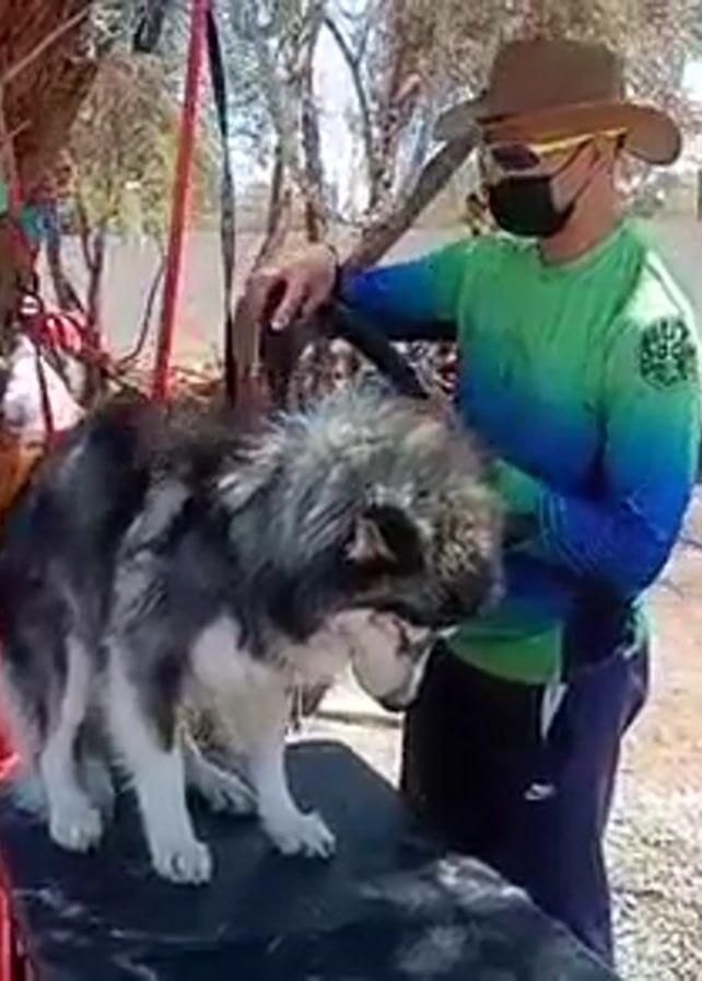 A man wearing a tan hat, sunglasses, a black face mask, a blue and green long-sleeved shirt, and dark-colored pants is drying a dog with a blower. The dog is gray, black, and white, and is standing on a black table. There's a red bucket in the background, and various items hanging from a tree. The setting appears to be outdoors.