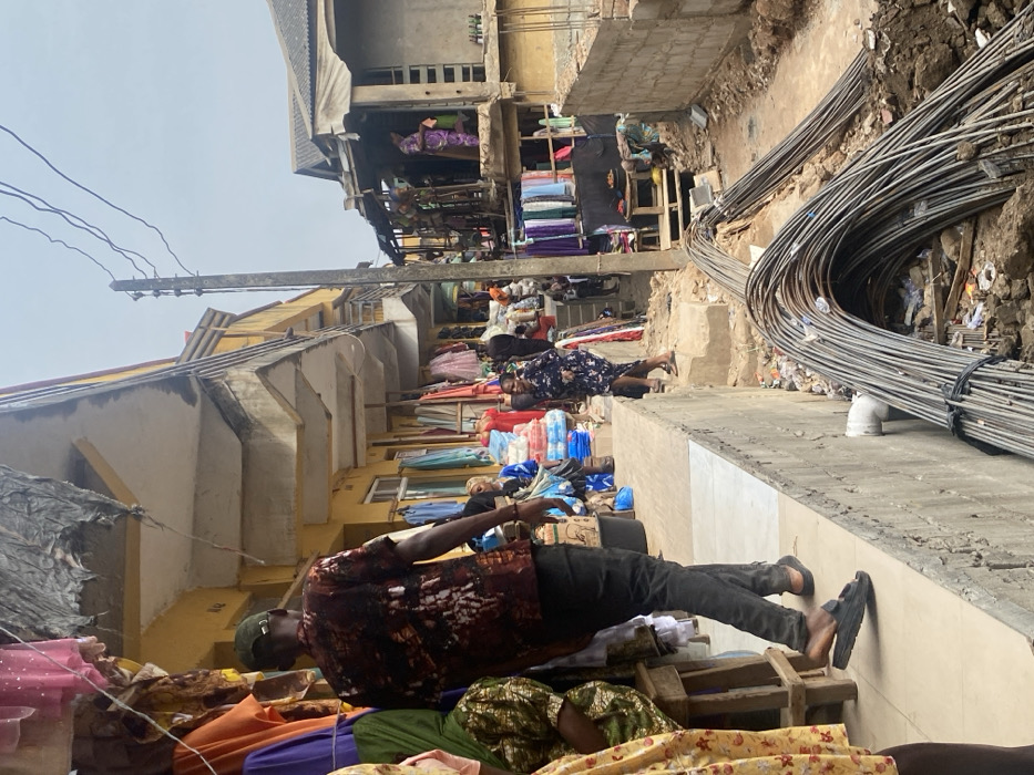 A crowded outdoor marketplace shows people reclining on goods or surfaces. In the foreground, a man in a patterned shirt and black pants lies down. Behind him, others also rest, some on mattresses and cloth rolls. Buildings of varying heights line the scene, with clothes and fabric hanging from upper levels. A pile of bundled metal rods sits by a concrete barrier. The sky is overcast.