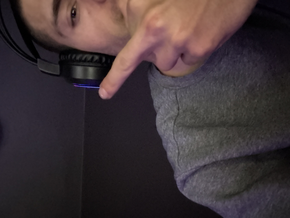 The scene is an interior shot located in Tsenovo, Bulgaria. The image features a male individual, visible from the chest up and cropped, occupying the central and right portions of the frame. He has short hair and light facial stubble. He is wearing a grey crew-neck sweatshirt. Black over-ear headphones are positioned on his head, covering his right ear. The exterior of the right headphone ear cup displays a vertical strip of blue and purple light. His right hand is raised; the index finger is extended and makes contact with the outer surface of the right headphone ear cup, while his thumb rests near his chin or mouth. The background consists of a plain, dark-colored wall or surface, with a subtle horizontal seam visible in the upper left quadrant. The lighting is dim, with a faint purple ambient glow evident.