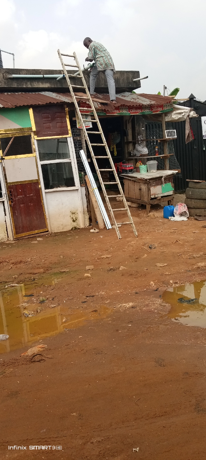 An exterior daytime image depicts a muddy, unpaved street scene in the city of Unknown, Unknown, under an overcast sky. One adult male, dressed in a patterned short-sleeved shirt and grey trousers, stands barefoot on the rusty corrugated metal roof of a single-story building. He is positioned near a concrete parapet wall and appears to be working on a light blue PVC piping system attached to the wall. A tall, white, multi-rung ladder leans against the roof structure, extending from the ground to the rooftop. The building's facade consists of mixed materials: multiple brown and gold-framed panel doors and a white-framed window are visible on the left. The right section, identifiable as a shop by "Chivita" branding above, displays bottles of Coca-Cola, various containers, and a small solar panel mounted on a wooden frame. Below the shop counter, two blue plastic jerrycans and white bags rest on the ground, adjacent to a stack of black tires. A bundle of white rods or pipes leans against the building near the base of the ladder, where a single light-colored sandal is also present. The foreground is dominated by uneven, reddish-brown mud with visible tire tracks, several reflective puddles of water, and scattered debris. In the background, green foliage and additional structures, including a dark water tank on a concrete support, are partially visible.