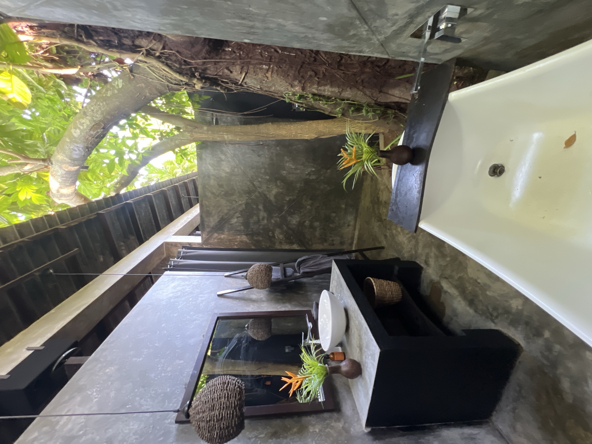 n outdoor bathroom in Peleana, Sri Lanka. The bathroom features a white bathtub, a black sink vanity with a white bowl sink, and a mirror. Woven baskets are used for decoration and storage. The roof is partially open, exposing a tree branch and foliage above. The walls are concrete, and the overall setting blends natural elements with modern bathroom fixtures. There are no people present in the image.