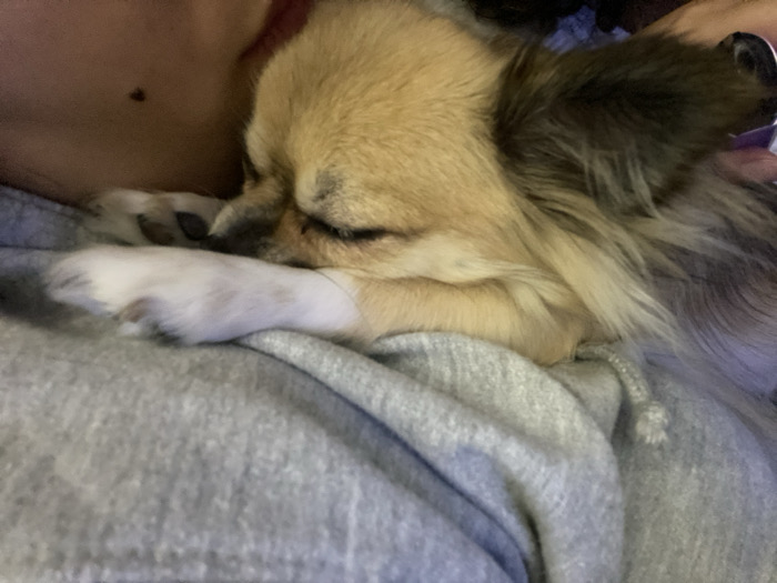 - "A small, long-haired canine, identified as a dog, is depicted sleeping on a human's torso" by FM-Aco812, licensed under CC BY 4.0