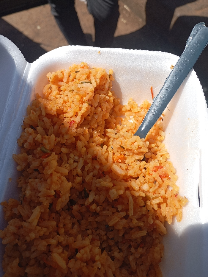- "A close-up, high-angle shot depicts a white foam take-out container filled with reddish-orange jollof rice, positioned outdoors under bright sunlight" by FM-WBnJu2, licensed under CC BY 4.0