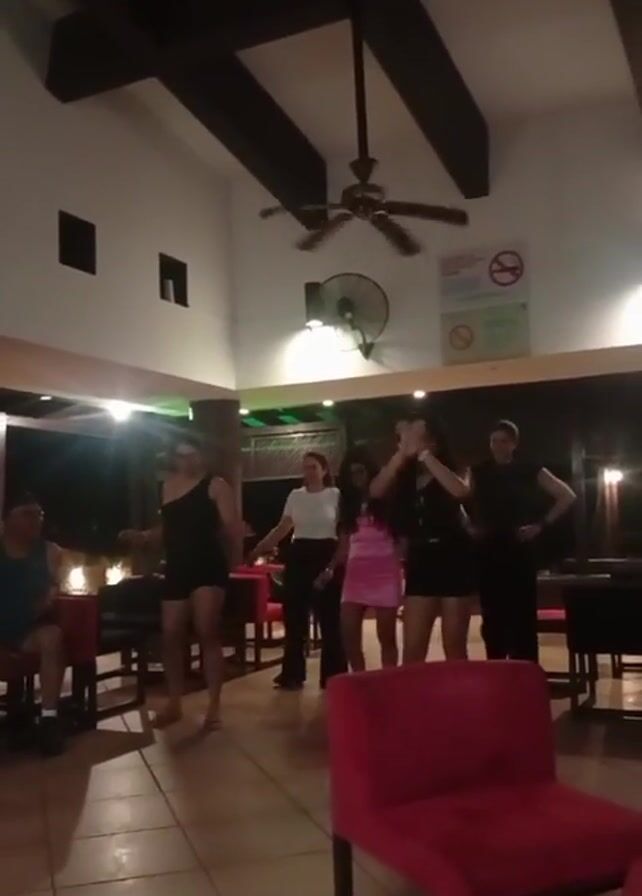 A group of five young women are dancing to music in a hotel bar. They are dressed in a variety of outfits, including black shorts, a pink dress, and black pants. One older male patron is seated in the background, watching. The bar is well-lit and has a high ceiling with dark wood beams. A ceiling fan is spinning. Red chairs are scattered around the room. A no smoking sign is visible on the wall.