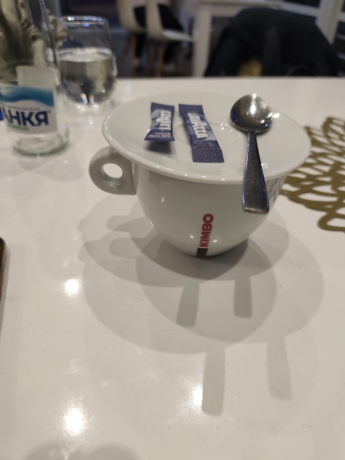 A white ceramic coffee cup, branded with a vertical red "KIMBO" logo, sits on a glossy white table surface in an indoor establishment, location Unknown, Unknown. An inverted white ceramic saucer functions as a lid for the cup. On top of the saucer are two purple "LAVAZZA" branded sugar packets, one displaying "TORINO ITALIA 1895," and a small, silver-colored metal spoon. To the left of the cup, a clear plastic water bottle with a blue label and a clear glass containing water are visible. A portion of a golden, decorative placemat or coaster is present on the table to the right. The background, out of focus, reveals a cafe or restaurant interior with blurred white tables, chairs, and a dark garment draped over a chair. No individuals or active interactions are depicted.