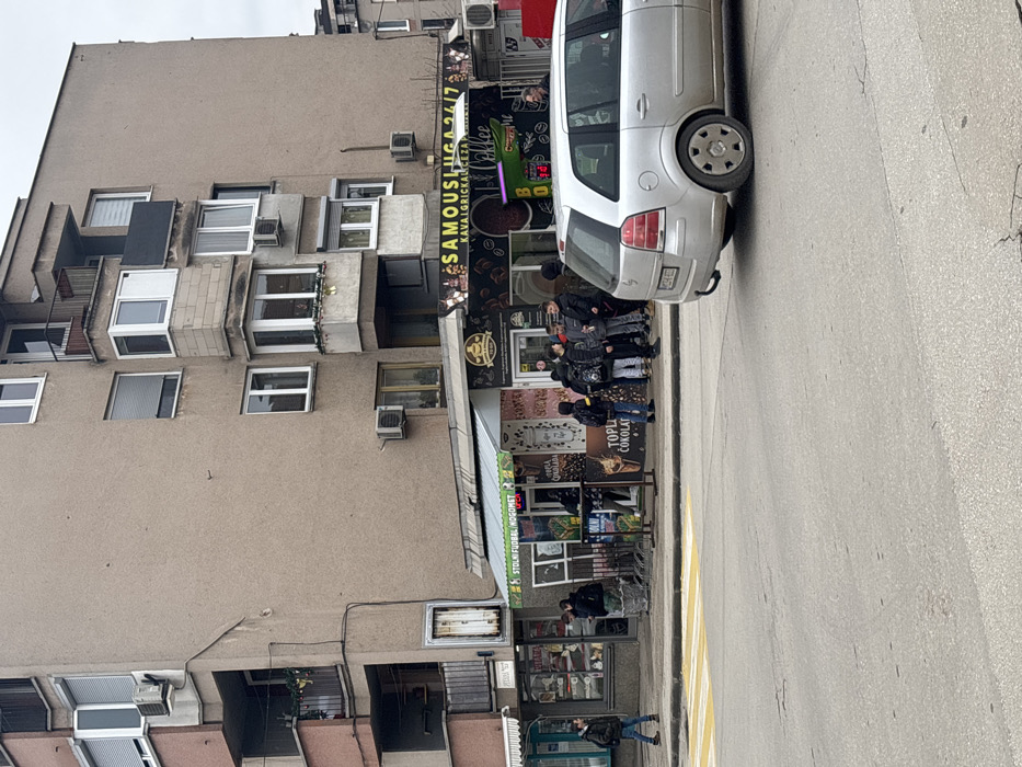 The image depicts a street scene in Vitez, Bosnia and Herzegovina, specifically focusing on the ground level of a multi-story, light brown apartment building. The building features various windows, some with external shutters, and multiple balconies, some enclosed, along with several visible air conditioning units. At the street level, there are multiple commercial establishments. To the left, a store with a turquoise awning is visible. Adjacent to it, a kiosk with a green and white striped awning displays "STOLNI FUDBAL MOGOMET" (table football) and advertising for "TOPLA ČOKOLADA" (hot chocolate) and coffee. Directly to its right is another self-service kiosk with a dark awning featuring "SAMOUSLUGA 24/7" (self-service 24/7) and "KAVA GRICKALICE ZA PONJETI" (coffee snacks to go) signage, illuminated by a purple neon light. On the asphalt road in the foreground, a silver Opel Zafira station wagon is positioned with its rear facing the viewer. The vehicle bears a Bosnian license plate, M34-K-602, and has a visible tow hitch. A pedestrian crossing, marked with yellow paint and white stripes, is visible on the street to the left of the car. Multiple individuals are present. On the sidewalk to the far left, a male pedestrian wearing a dark jacket and jeans walks from left to right. A small group of people is visible near the kiosk with the green awning, including one individual seated at an outdoor table. A larger group of approximately 8-10 young males, predominantly wearing dark jackets and backpacks, are congregated directly in front of the "SAMOUSLUGA 24/7" kiosk, potentially queuing. Another adult male in a lighter jacket is visible to their right near the same kiosk. The overall scene suggests a typical urban environment during daylight under an overcast sky.