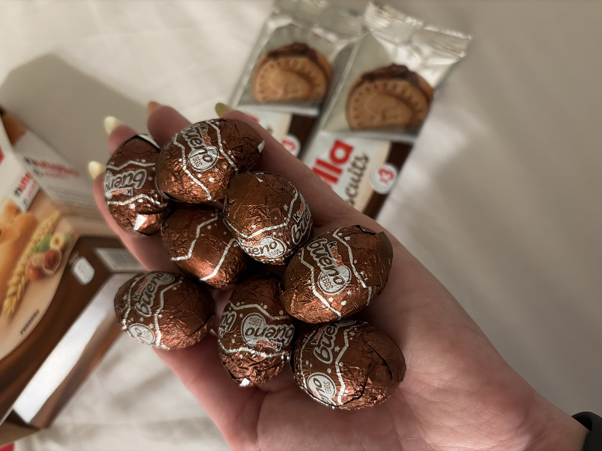 A person's hand holds a handful of Kinder Bueno chocolate eggs