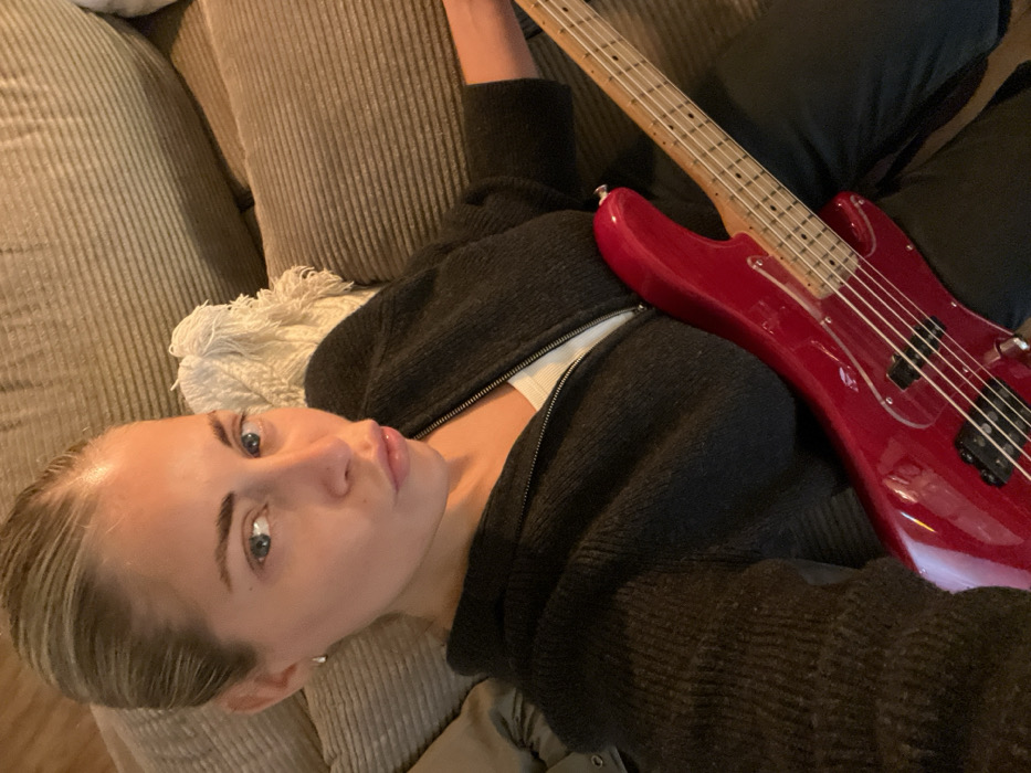 An adult female is depicted in a close-up, top-down perspective selfie, seated or reclining on a ribbed, light brown upholstered sofa. Her blonde hair is pulled back. She has light skin, blue eyes, and her lips are pursed. A small silver stud earring is visible in her left ear. She is wearing a dark, possibly charcoal gray or black, zippered cardigan over a white ribbed top and dark pants. A bright red five-string electric bass guitar with a maple fretboard, black pickups, and a clear pickguard rests diagonally across her lap. Behind her, a light-colored, possibly white or off-white, tasseled knitted throw blanket is visible draped over the sofa. The scene is indoors, consistent with a domestic setting in the city of Roubaix, France.