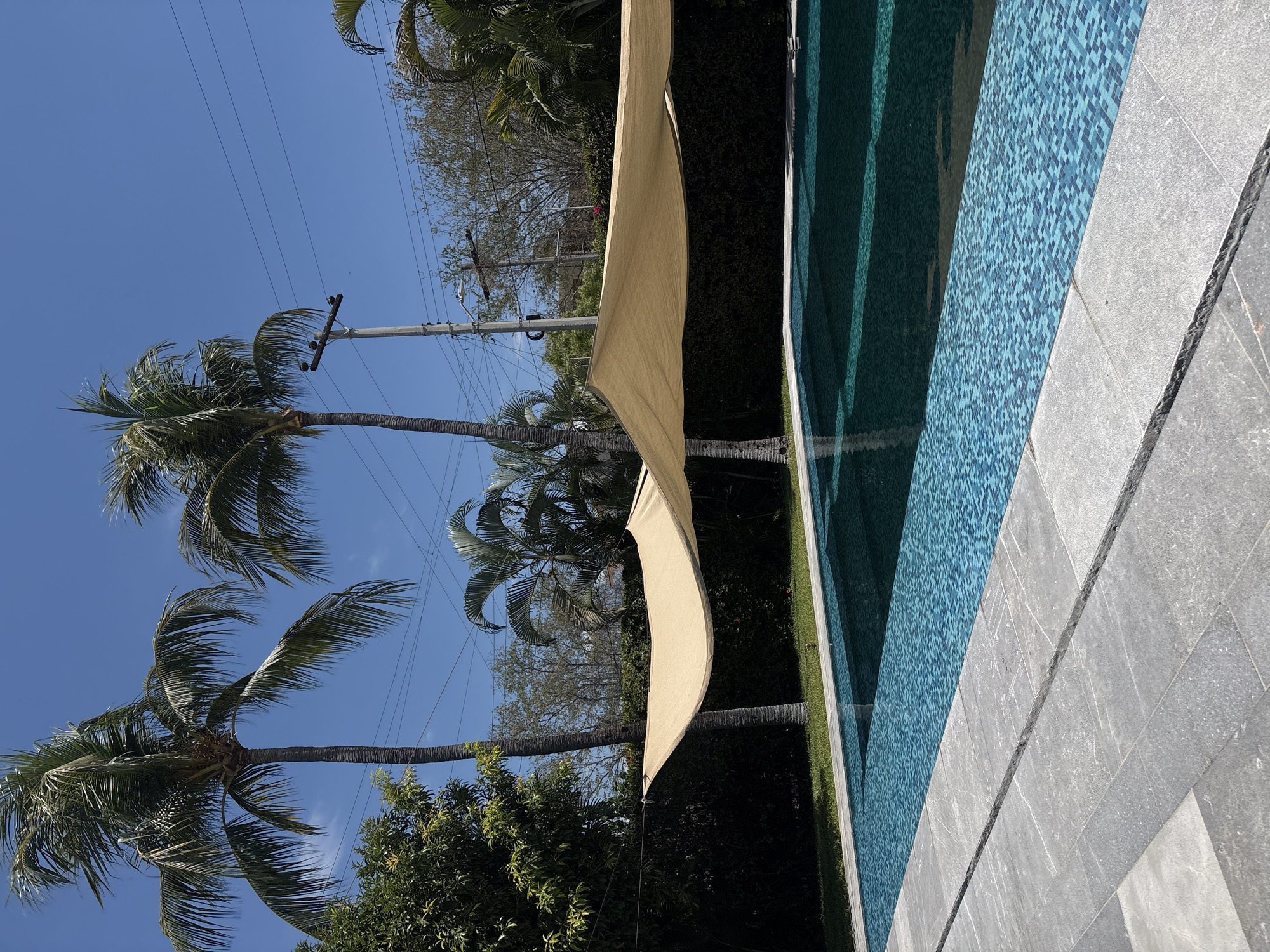 The image captures a scene in Puerto Escondido, Mexico, featuring a swimming pool with blue mosaic tiles and a gray stone border. A shade sail provides cover from the sun, suspended from palm trees. Power lines are visible in the background against a clear blue sky. Lush green vegetation surrounds the pool area.