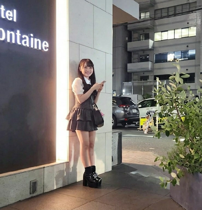 - "An outdoor, eye-level photograph depicts a young East Asian female standing on a paved sidewalk next to a building, in what is identified by a partially visible illuminated sign as "Hotel Fontaine", suggesting a location in Shibuya, Japan" by FM-g4ca33, licensed under CC BY 4.0