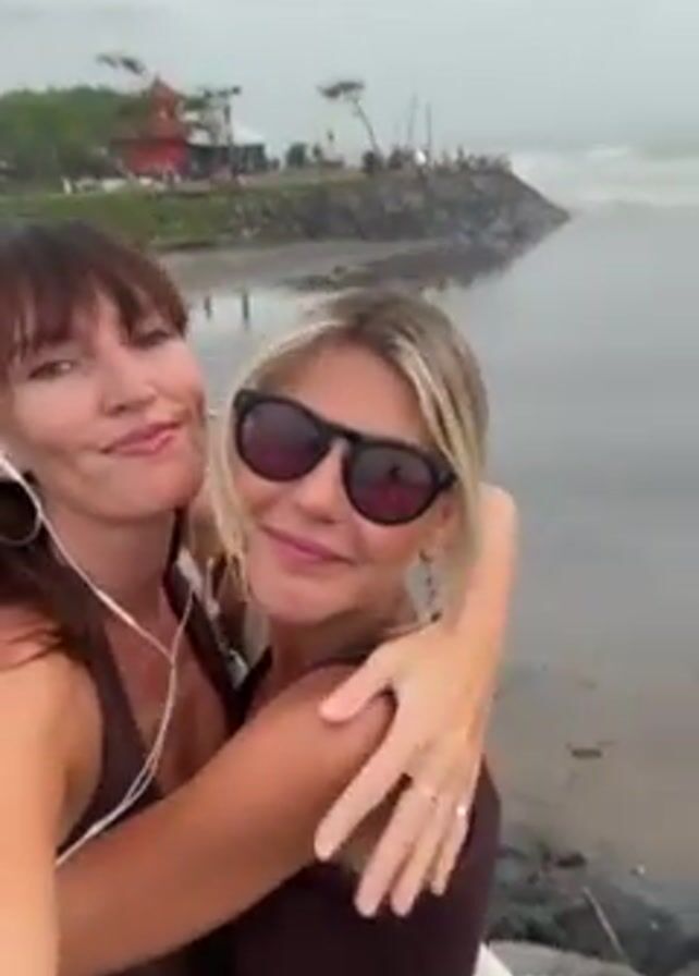 Two women are hugging and taking a selfie video on a beach. The woman on the left has long brown hair with bangs and is wearing a brown tank top, large hoop earrings, and white earphones. The woman on the right has blonde hair, is wearing black sunglasses and a brown tank top. The background shows a beach with waves and a cloudy sky. There are rocks visible on the edge of the beach.