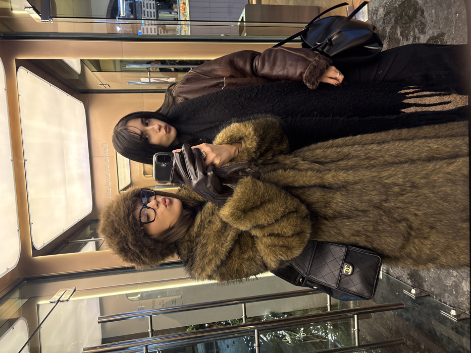 Two women pose for a selfie in an elevator. The first woman wears a large fur hat, glasses, a fur coat, and leather gloves as she holds a smartphone and puckers her lips for the camera. The second woman, standing behind her, has dark hair with bangs and wears a brown jacket and a large black scarf. Both women have designer handbags. The background is reflected in the elevator walls.
