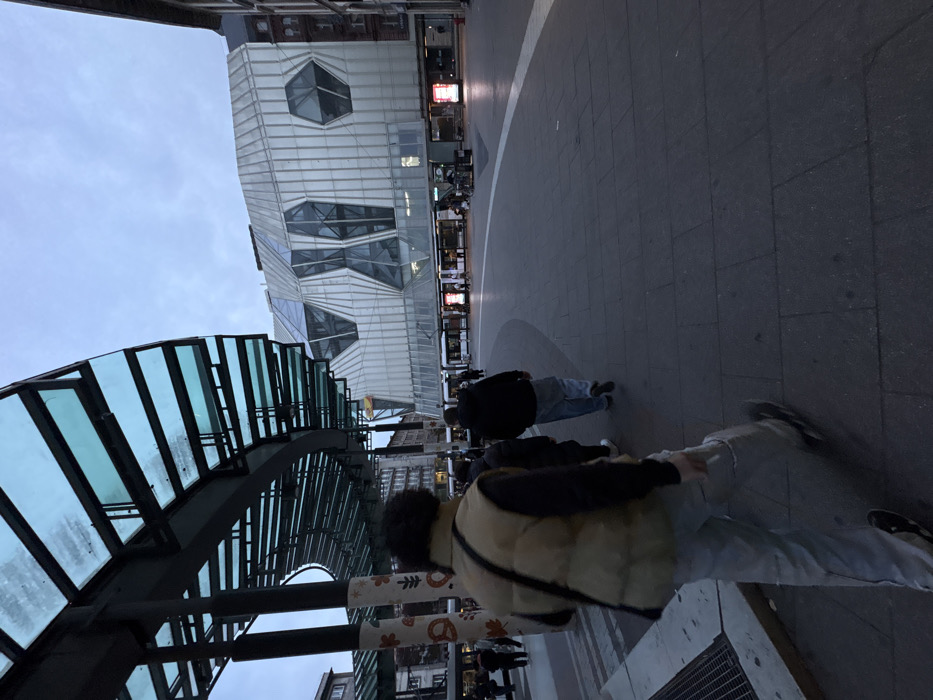 The image depicts an urban pedestrian square, specifically Place des Halles in Strasbourg, France, at dusk or early evening. In the foreground, a person walks away from the camera, wearing a dark long-sleeved shirt, a light tan puffer vest, light-colored pants, and dark shoes; a dark strap from a bag crosses their back. To their left, a dark metal structure with a curved, translucent blue-green glass canopy extends overhead, supported by cylindrical pillars, one featuring light-colored decorative panels. The ground is paved with dark grey square tiles. In the midground, several other individuals are walking away from the camera, including one in a dark jacket and light blue/grey pants. The background is dominated by the Centre Commercial Place des Halles, a large, modern building characterized by a light-colored, textured facade with multiple irregularly shaped, faceted glass windows. Its ground level features large rectangular storefront windows displaying internal lighting and advertising posters. To the far right, an older, darker building with traditional windows is visible. In front of the shopping center, several light-colored tram vehicles are present at what appears to be a tram stop, with various pedestrians scattered across the plaza. The sky is overcast and uniformly grey.