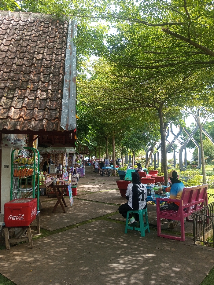 A bustling outdoor space features vendors under a tiled roof. People are seated at colorful tables, enjoying the shade beneath tall, leafy trees. A woman in a black and white jersey sits on a green stool, while another woman sits on a pink bench. A red Coca-Cola cooler is visible near one of the vendor stands. Decorative, abstract structures are seen in the distance.