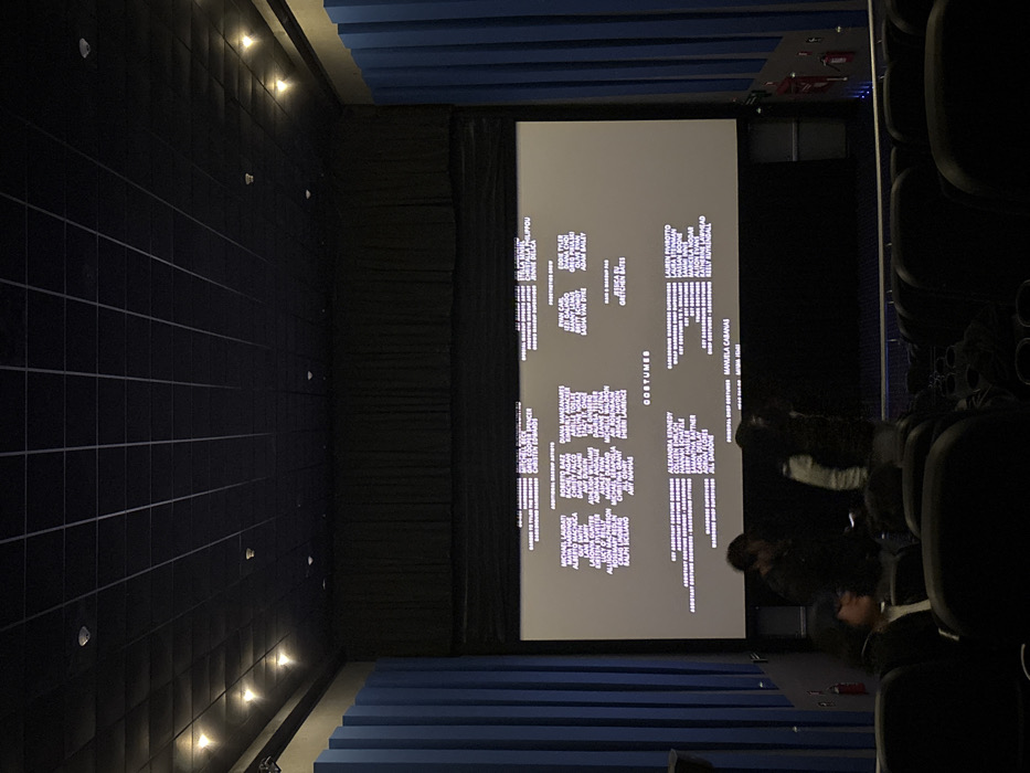 A dimly lit movie theater displays the end credits on a large screen. Rows of blue steps lead up to the screen, while dark seats are visible on the right. The side walls are dark with recessed lighting. People are seated in the foreground. The scene is likely captured at the end of a film.