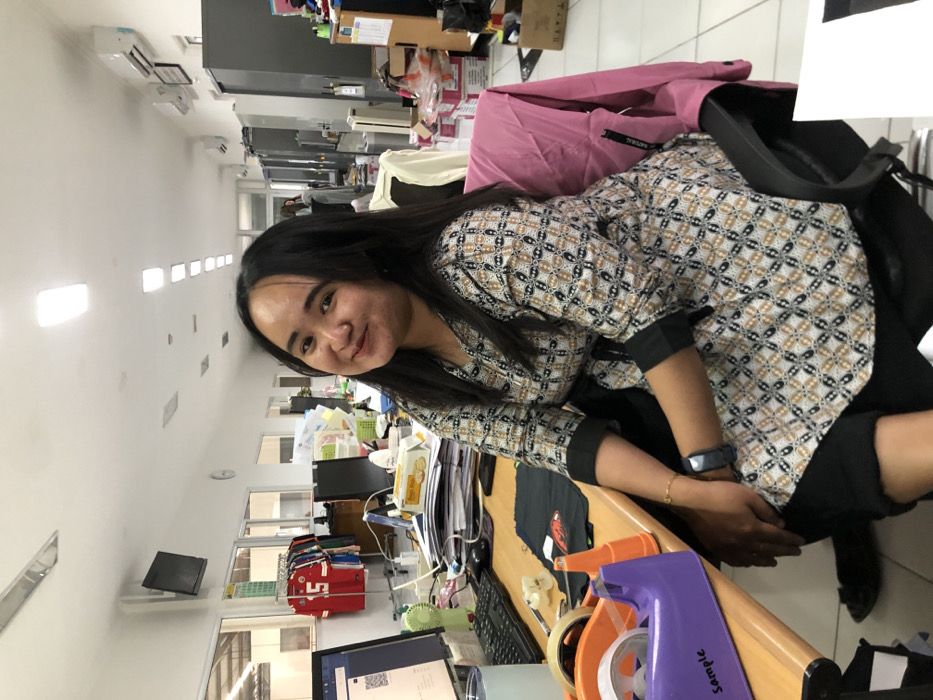 An indoor photograph depicts a woman seated at an office desk in Semarang, Indonesia