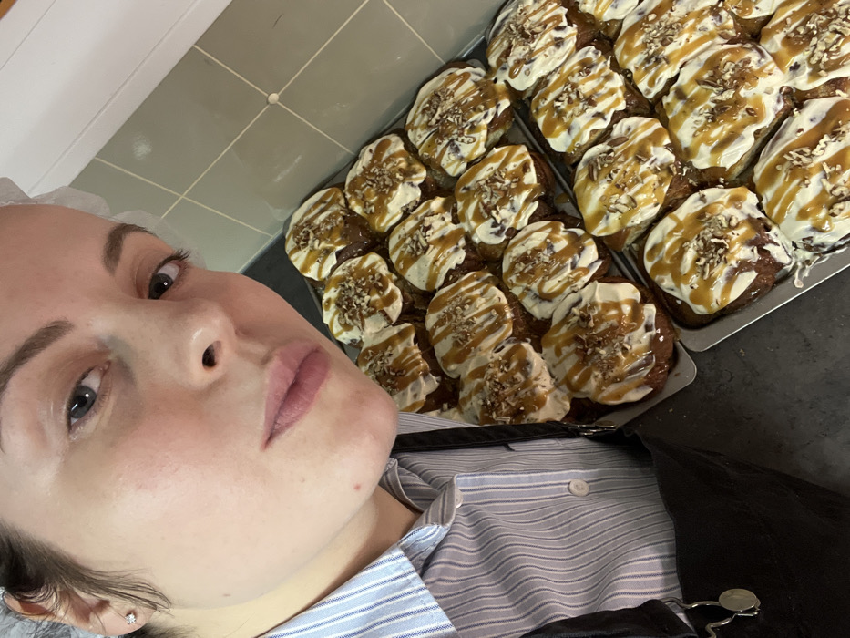 A woman wearing a hairnet and a striped button-down shirt poses next to a tray of decorated cinnamon rolls. The rolls appear to have icing, caramel sauce, and chopped nuts on top. The woman's face is close to the camera, showing her left eye and cheek prominently. A black apron is partially visible on her right. The cinnamon rolls are arranged in neat rows on a metallic tray.