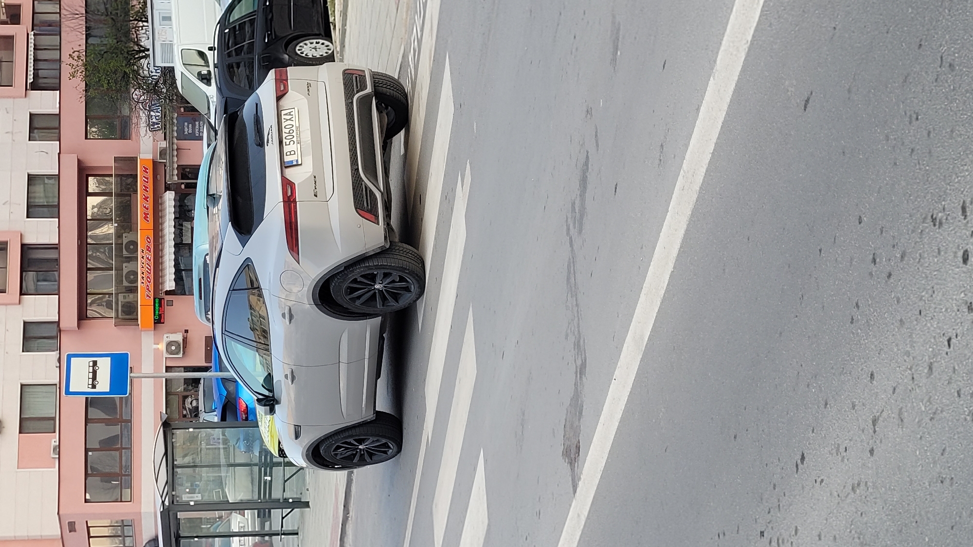 white Jaguar E-Pace parked on a crosswalk in Varna, Bulgaria. The license plate of the car is B 5060 XA. Behind the car is a bus stop and a building with a sign that reads "ЗАХУСКИ ТРОШЕВО МЕКНИИ". The road is asphalt and has a white line marking the edge. The weather is sunny. There are other cars parked nearby, including a black van and a white van.