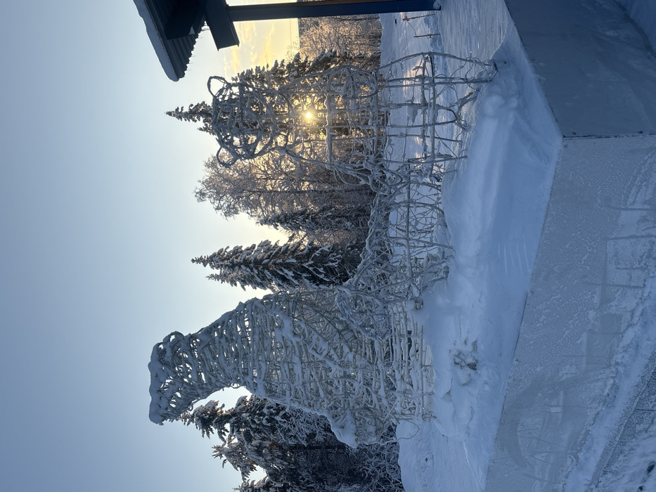 The image depicts an outdoor winter scene in Apatity, Russia, under a clear, pale blue sky with a low sun. Two large, white wireframe animal sculptures, heavily encrusted with snow and ice, are the central subjects. The left sculpture portrays an animal standing on its hind legs, possibly a bear, with its head raised. The right sculpture depicts a four-legged animal, consistent with a deer or reindeer, positioned in front of the low-angled sun, which creates a visible starburst effect. Both sculptures rest on a large, rectangular, snow-covered base of a light-colored material, which also shows frost accumulation. In the background, a dense forest of snow-covered coniferous trees dominates, interspersed with some deciduous trees also bearing a heavy frost and snow load. The sun's light filters through these trees, illuminating frosted branches. The ground is uniformly covered in deep, undisturbed snow. On the far right, the edge of a light-colored building's roof is visible, from which several icicles hang, along with a structural support element. No human figures or discernible activities are present within the frame.