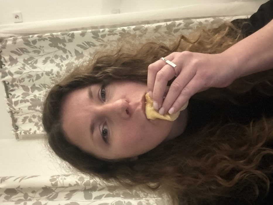 A woman with long, curly brown hair is shown in a close-up shot while eating. She holds a piece of what appears to be bread or pastry with her fingers, bringing it to her mouth. Her skin tone is fair, and she wears a ring on her finger. The background includes a patterned curtain or drapery, suggesting an indoor setting. The photo is taken at an angle, with the woman's face tilted towards the camera.
