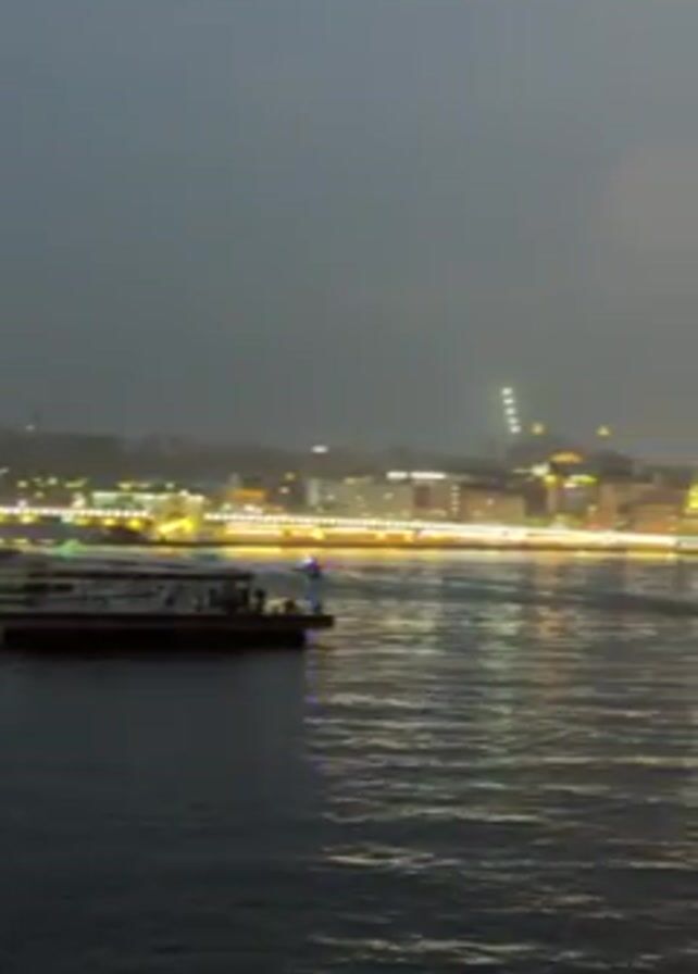 nighttime cityscape across a body of water, with numerous lights creating a glowing effect against the overcast sky. Several boats, illuminated with lights, move across the water. The most prominent feature of the cityscape is a large mosque with two minarets, also brightly lit. The overall atmosphere suggests a tranquil, yet somewhat somber scene, due to the dark water and heavy sky. There are people on the boats.