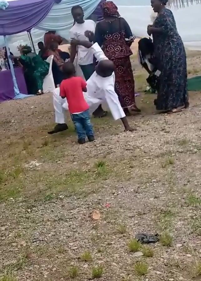 The scene is an outdoor gathering, possibly a celebration or wedding, with a white tent adorned with purple drapes in the background, where seated guests can be seen. In the foreground, a man dressed in white is on his hands and knees, seemingly dancing or playing on the ground. A small child in a red shirt and jeans stands near him, observing. Several adults surround them, some clapping and smiling. The ground is mostly dirt and gravel with some patches of grass. The lighting is natural and bright.