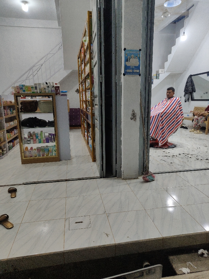 This image depicts an interior view of a commercial establishment in Gampongpaya, Indonesia, divided into two primary functional areas. The left side of the scene appears to be a retail space, likely a shop selling personal care products or cosmetics. It features multiple light-colored wooden shelving units stocked with various bottles, tubes, and containers. A central glass display case with a wooden frame also holds numerous products and a dark brown satchel or bag on its middle shelf. A small, upholstered purple bench or sofa is partially visible in the background against a white wall. The right side of the scene functions as a barber shop. A male subject, with short dark hair and facial stubble, is seated in a red barber chair, draped with a red, white, and blue striped barber cape. Dark hair clippings are scattered on the white tiled floor around the barber chair. A large rectangular mirror with a dark frame is mounted on the back wall, below which a camouflage-patterned jacket or shirt hangs on a hook. Another individual, whose lower body is visible, is seated on a light-colored wooden bench in the background. Both sections feature white walls and a white tiled floor with subtle gray marbling. A white staircase with a metal railing is visible ascending in the background of both areas, suggesting a multi-level building. Overhead lighting fixtures are present in both sections. A wide, light gray column and adjacent dark gray vertical structures, likely part of an open rolling security gate or folding door, form a central doorway separating the two areas. A blue and white poster, secured by two dark clips, is affixed to the light gray column facing the barber shop side. A short, multi-colored (pink, blue, green) fiber brush or broom with a thin, dark handle leans against the column on the barber shop side. In the foreground, on the white tiled floor, two brown flip-flops or sandals are visible to the left. A rectangular metal plate, possibly a drainage cover or vent, is embedded in the floor in the central foreground. A dark-colored step or threshold runs across the bottom of the frame, below which white crumpled items are visible on a darker, unseen surface.