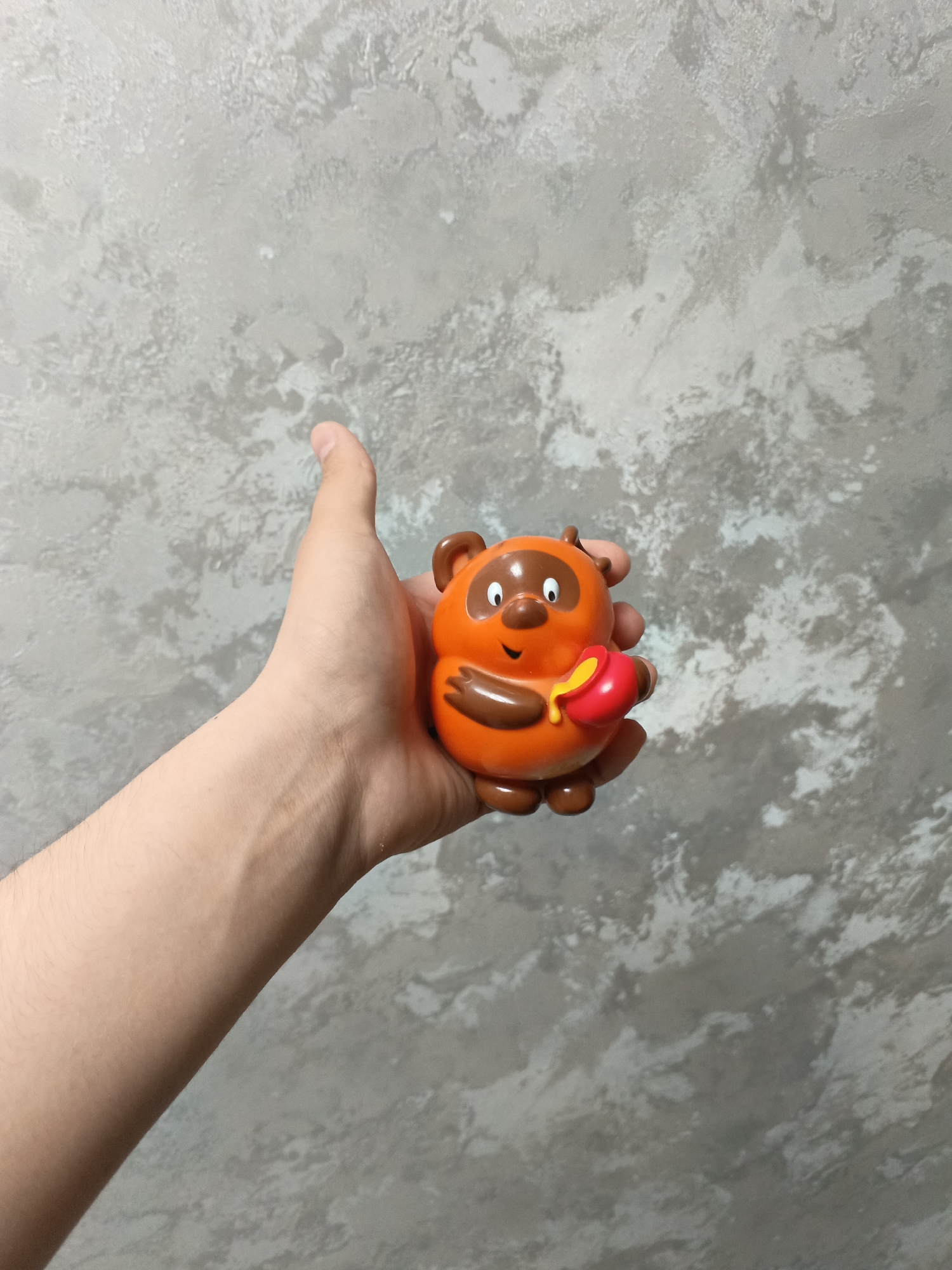 A person is holding a cartoonish, orange toy in the shape of a bear with brown accents. The bear is holding a small, red pot with yellow liquid pouring out. The person's hand and forearm are visible, appearing to be light-skinned. The background is a textured wall with grey and white tones. The location is Andreyevo, Russia.
