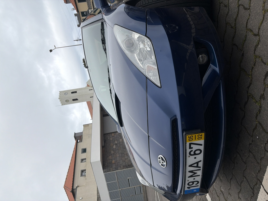 A dark blue Toyota Celica (T230 generation) is parked on a surface of grey interlocking paver blocks with minor weed growth in the seams