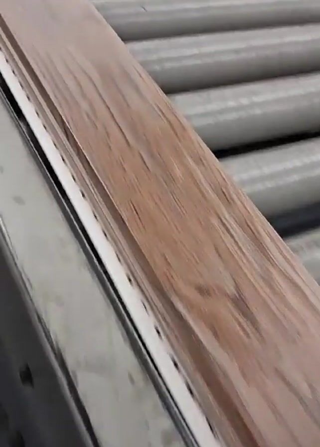 long plank of wood-grained material moving along a conveyor belt with gray rollers