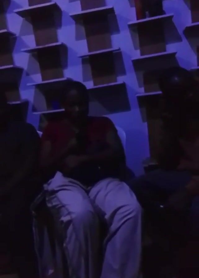 Three individuals are sitting in chairs in a room with blue lighting. The wall behind them has a pattern of multiple open shelves. Some bottles and cans are visible on the shelves. The person on the left is wearing a maroon top and grey pants. The person in the middle is wearing an orange shirt. The person on the right is wearing a blue jacket. They appear to be talking and laughing.