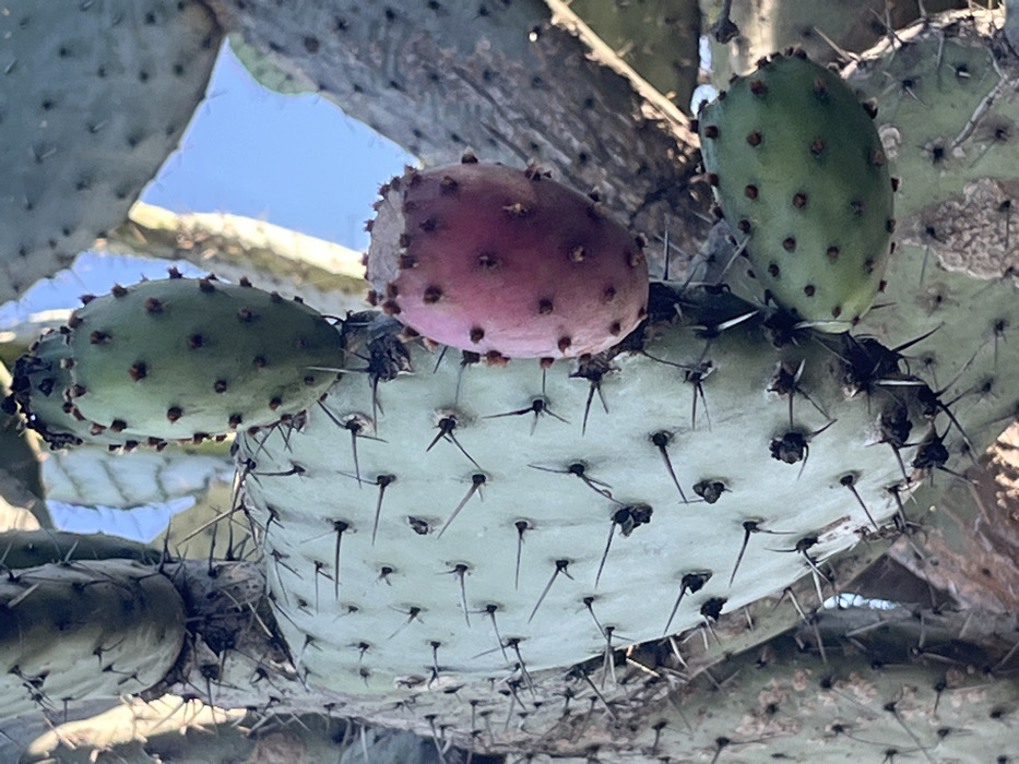 A close-up, forensic examination reveals a section of a mature Opuntia cactus plant, characteristic of the arid and semi-arid regions, located in Bernal, Mexico. The central focus is a large, light green cactus paddle, oblong and thick, densely covered with sharp, dark brown-to-black spines of varying lengths emanating from distinct areoles. Several smaller, reddish-brown glochids are also present. Three ovoid fruits, known as "tunas," are attached to the paddle. One prominent fruit, centrally positioned, is ripe, displaying a vibrant magenta-pink coloration across its surface, with numerous small, reddish-brown glochids. Its apex appears partially removed or consumed, exhibiting an irregular, lighter-colored edge. Above and to the right of this pink fruit is a smaller, unripe green fruit, covered in similar reddish-brown glochids. A third, similarly green and unripe fruit with glochids is located below and to the right of the pink fruit. Portions of additional, older cactus paddles, appearing darker green and more weathered, are visible in the blurred foreground and background. Gaps in the foliage reveal sections of a clear, bright blue sky, indicating an outdoor, daylight scene under direct sunlight. No human figures or other subjects are present.
